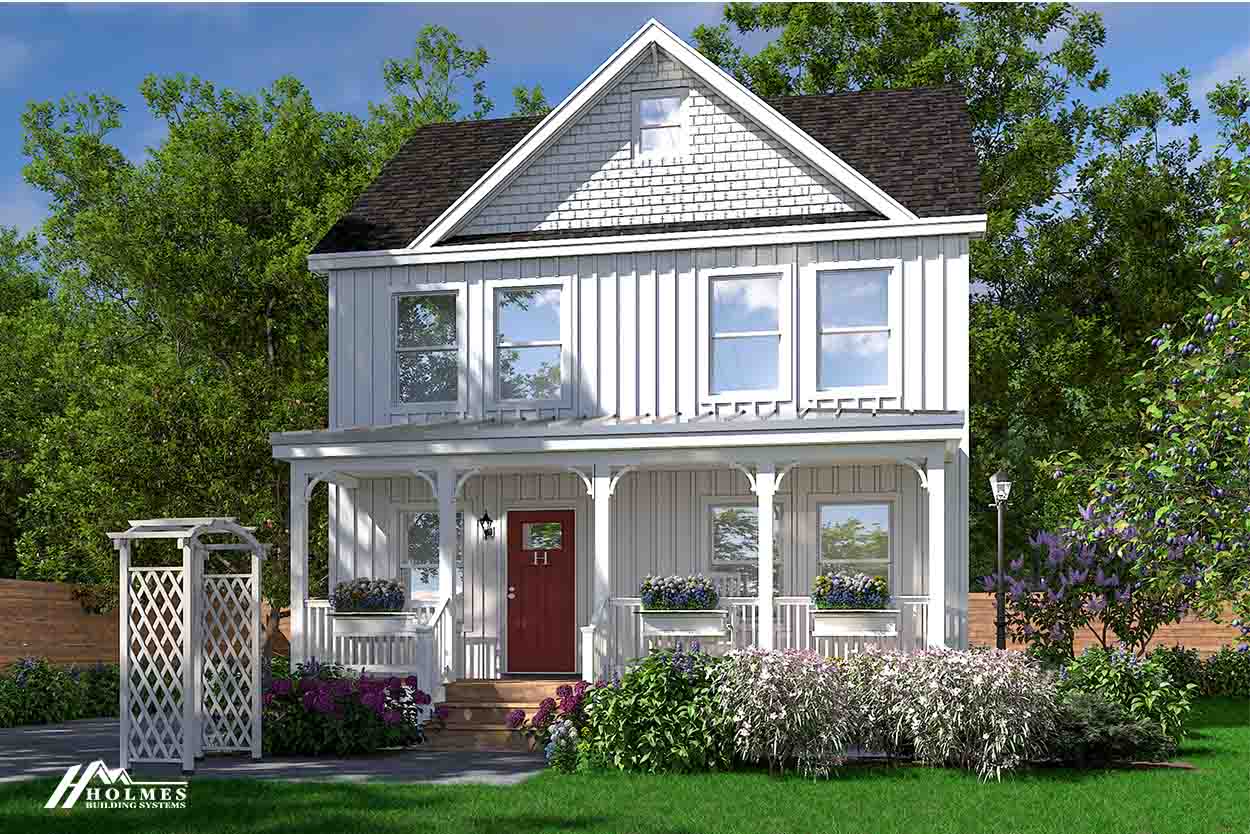 The Amelia Cozy Cottage Two-Story exterior exudes classic charm with a modern farmhouse aesthetic. Its whiteboard-and-batten siding gives the home a timeless and elegant appeal, while the contrasting-colored gable accent adds a touch of warmth and character. The standard 7/12 roof pitch enhances its traditional look. An optional 10/12 roof pitch is available.